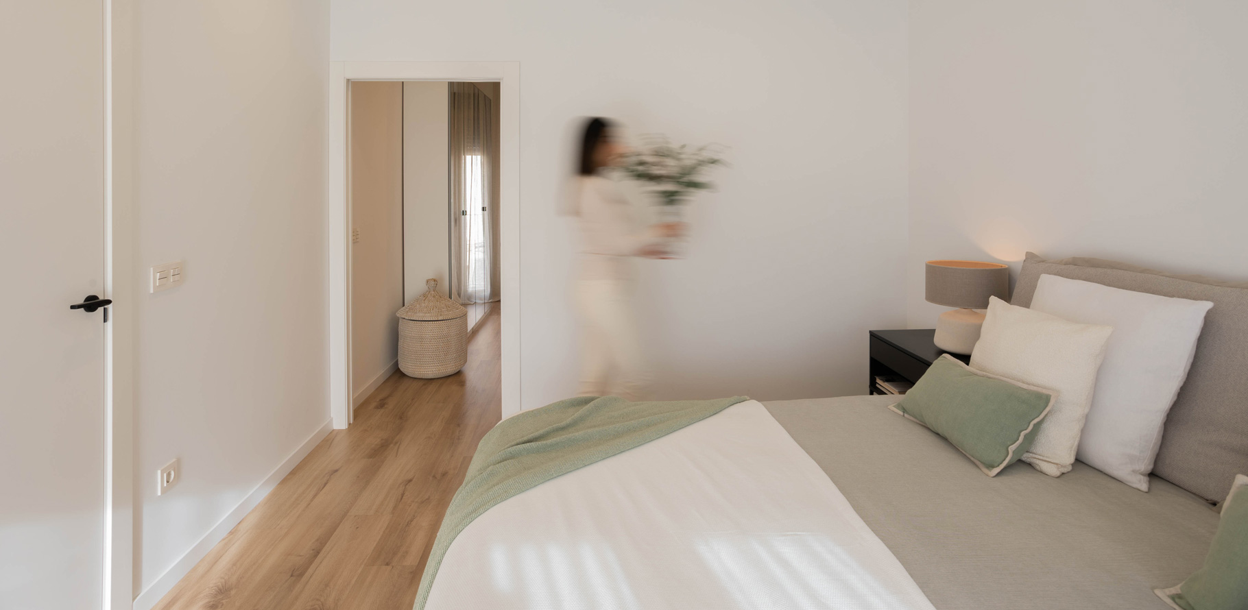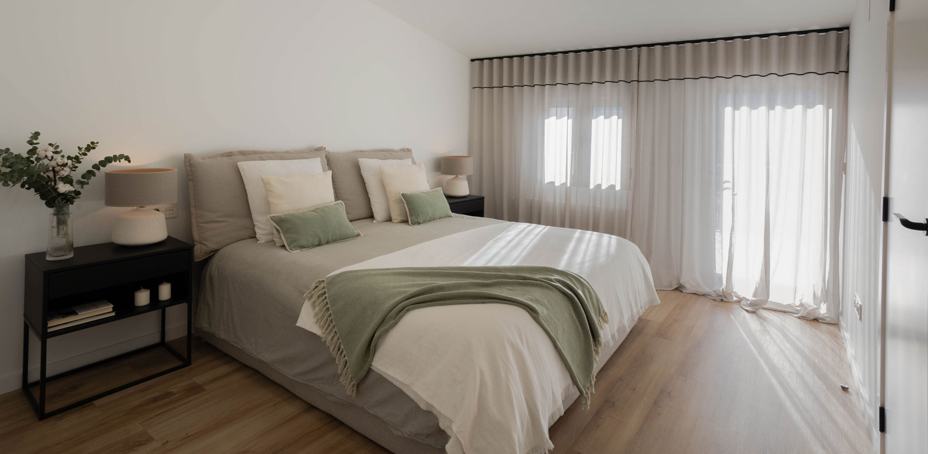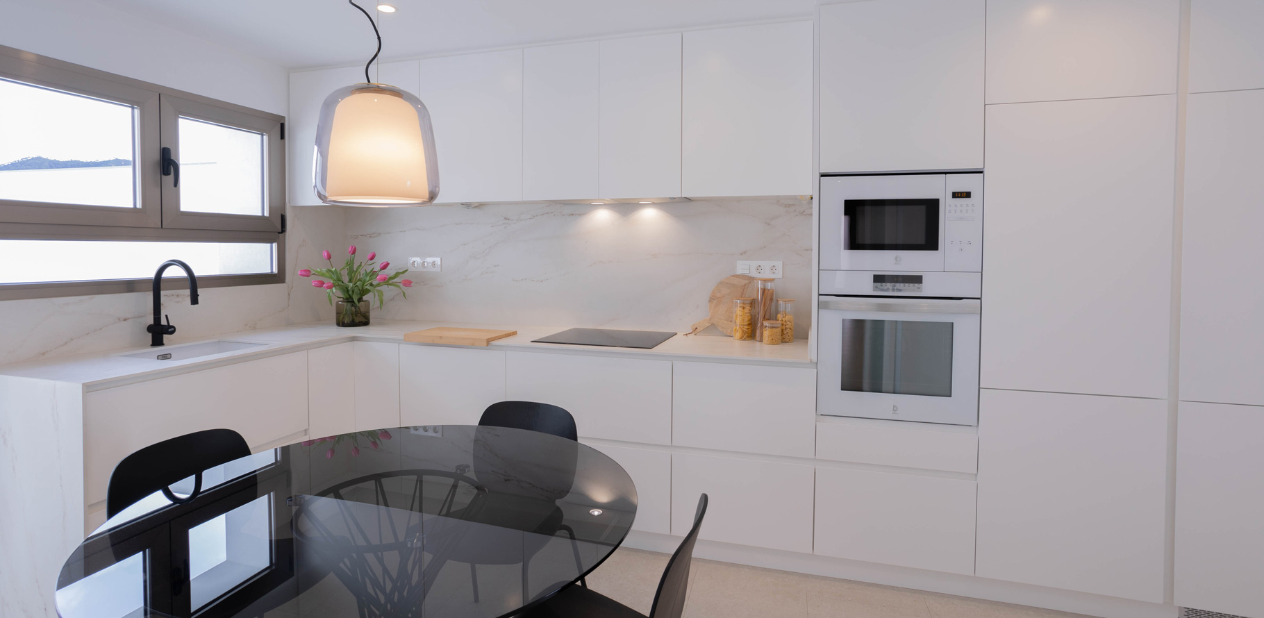 La cocina hecha a medida es uno de los elementos destacados del diseño, realizada en madera lacada y complementada con mobiliario de líneas sencillas pero cuidadas. Cada detalle ha sido pensado para ofrecer funcionalidad sin renunciar a la estética, utilizando tejidos de calidad y lámparas de diseño que aportan un toque distintivo a cada espacio.