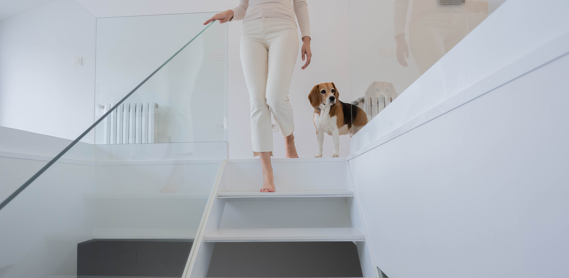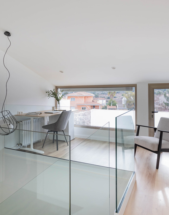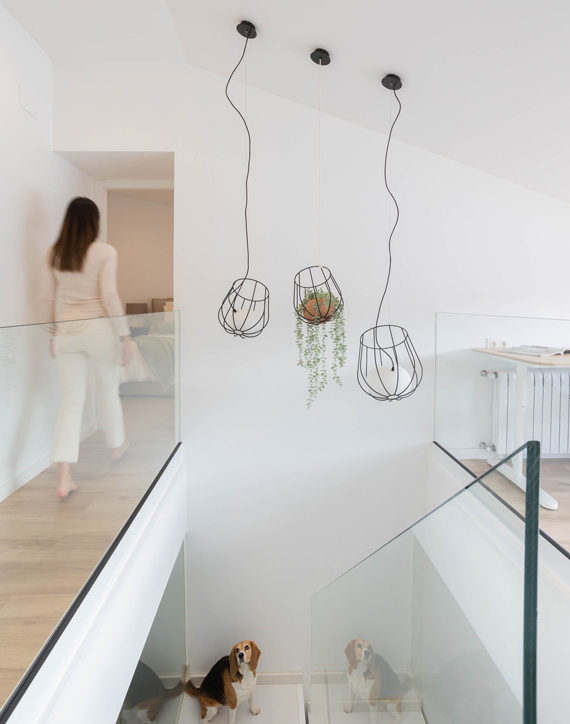 La escalera metálica se convierte en la protagonista de la vivienda, con un diseño minimalista en color blanco y barandillas de cristal que permiten que la luz fluya libremente a través de la doble altura. Esta elección no solo evita crear barreras visuales, sino que también contribuye a maximizar la luminosidad y la sensación de amplitud en toda la casa.