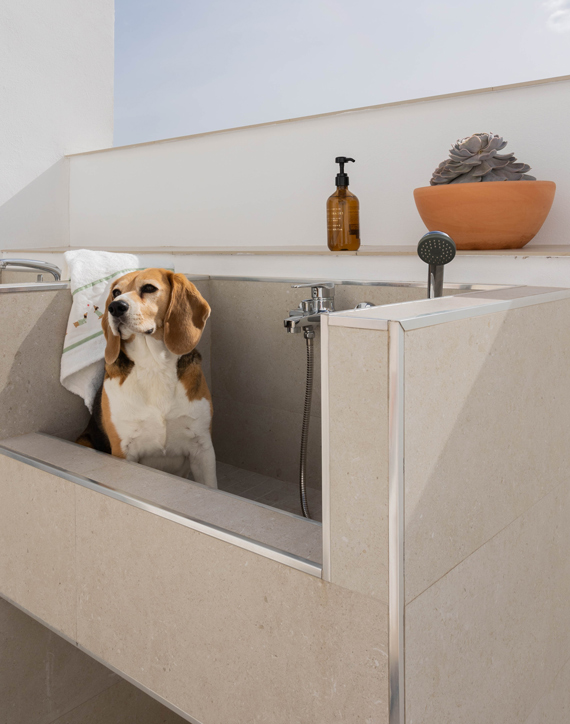 Un detalle especial de este proyecto es la ducha a medida para la mascota de la casa, ubicada en un pequeño patio, que añade un toque único y práctico, integrando la vida cotidiana con el diseño.