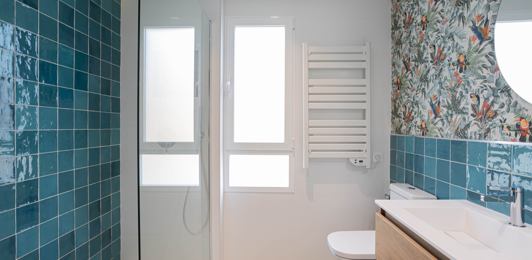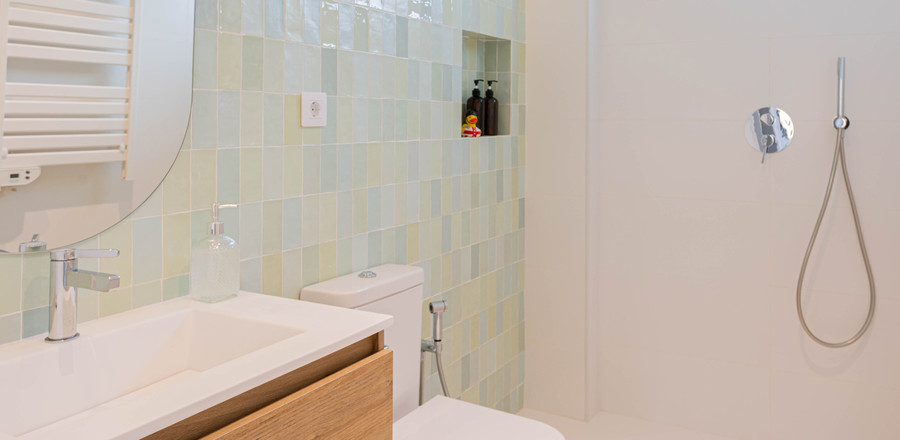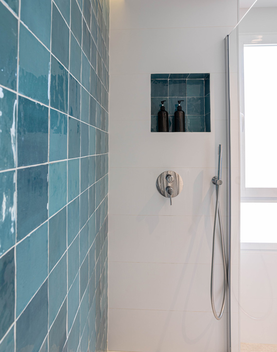 Los baños han sido diseñados partiendo de una base blanca, que aporta luminosidad y sensación de amplitud. Para añadir un toque de color y textura, se han incorporado azulejos zellige hechos a mano, que, con sus tonalidades únicas, se convierten en el punto focal de cada espacio. Además, el uso de madera en detalles y mobiliario añade un toque de calidez y armonía, equilibrando el diseño y aportando confort a la vivienda.